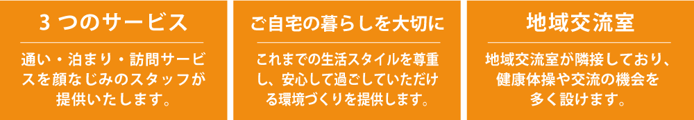 利用者様の在宅生活を支えるために必要な「通い」「泊まり」「訪問」の各サービスが包括的に含まれています。日中の通所による食事介助や入浴介助、機能訓練などの支援に加え、自宅での生活を支える訪問介護、必要に応じた宿泊サービスを組み合わせて利用することができます。また、季節ごとの行事やイベントにもご参加いただけるようになっており、四季を感じながら楽しみのある生活を送っていただけます。